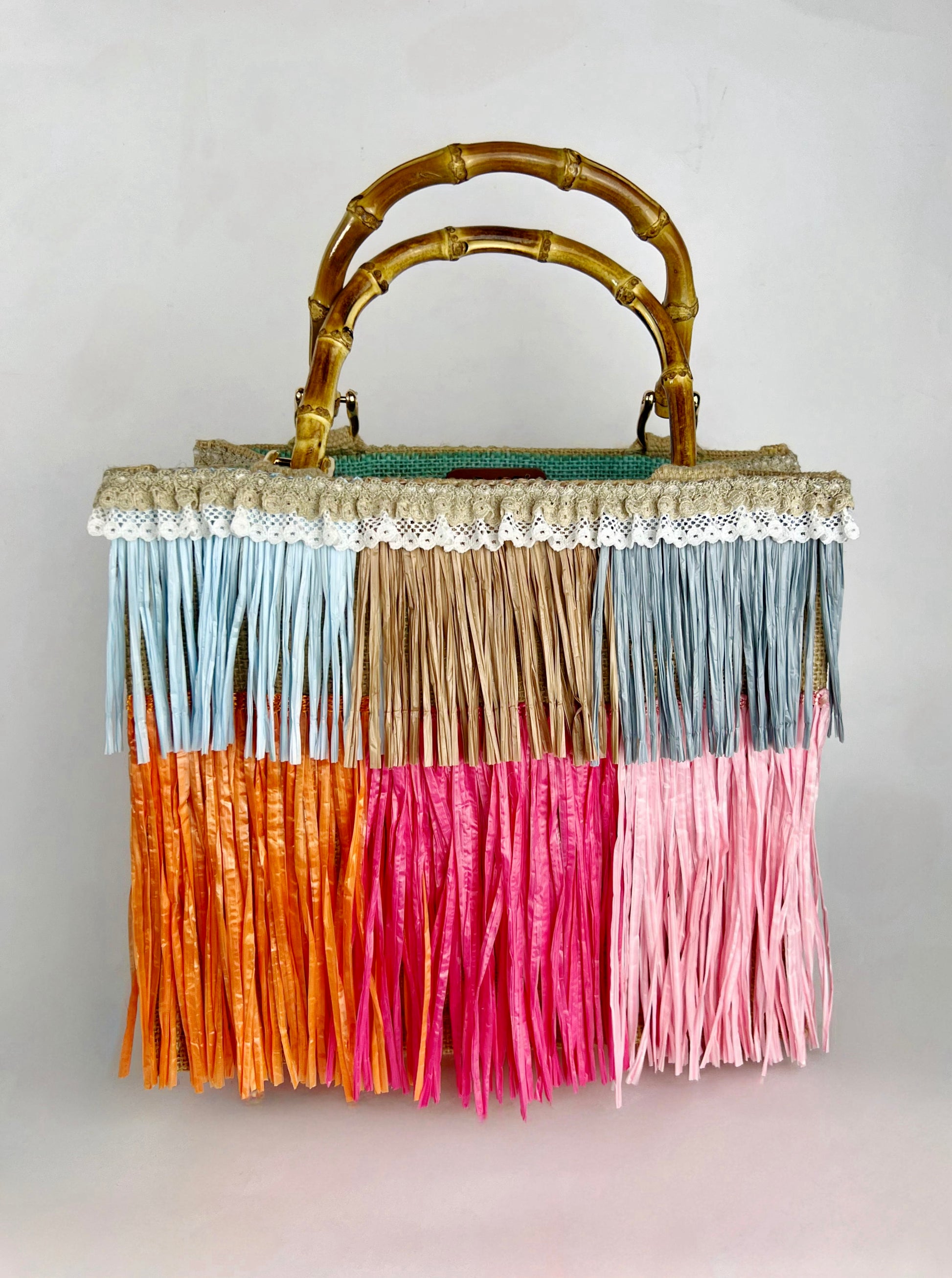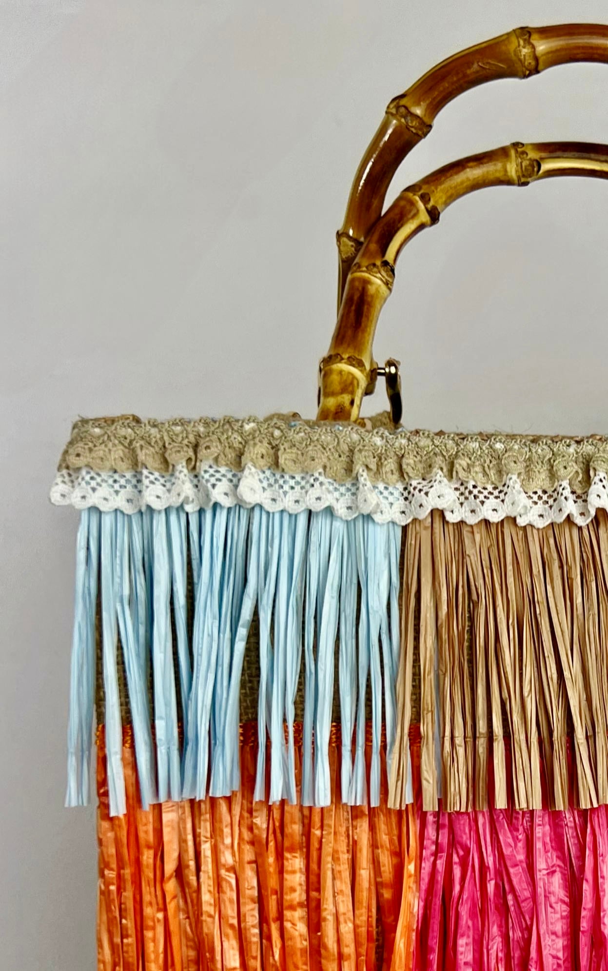 Borsa in Juta con frange di sei colori diversi stile patchwork, passamaneria in pizzo, nastro decorativo interno in juta verde/azzurro, manici in bambù.