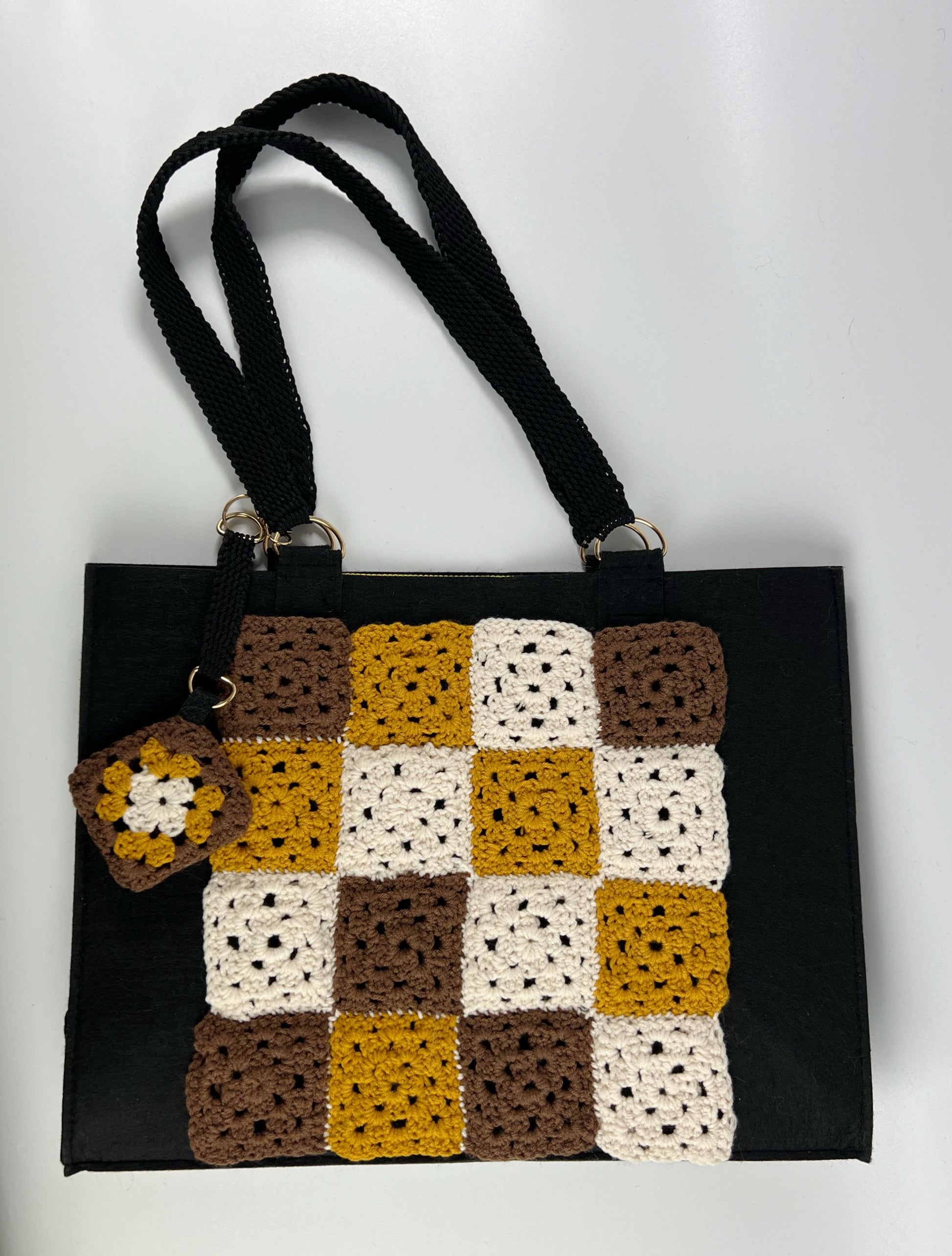 In feltro, materiale pratico e caldo che ben si adatta alle atmosfere autunnali e invernali, con applicazione sul davanti di una composizione di piccole mattonelle Granny, lavorata all'uncinetto, con filato lana misto poliestere, nei colori del panna, senape e marrone. In abbinato portachiavi con pendente piccola mattonella Granny con sostegno il feltro nero, sempre lavorata a crochet. Anche i manici della borsa e il cordino del portachiavi sono lavorati all'uncinetto.