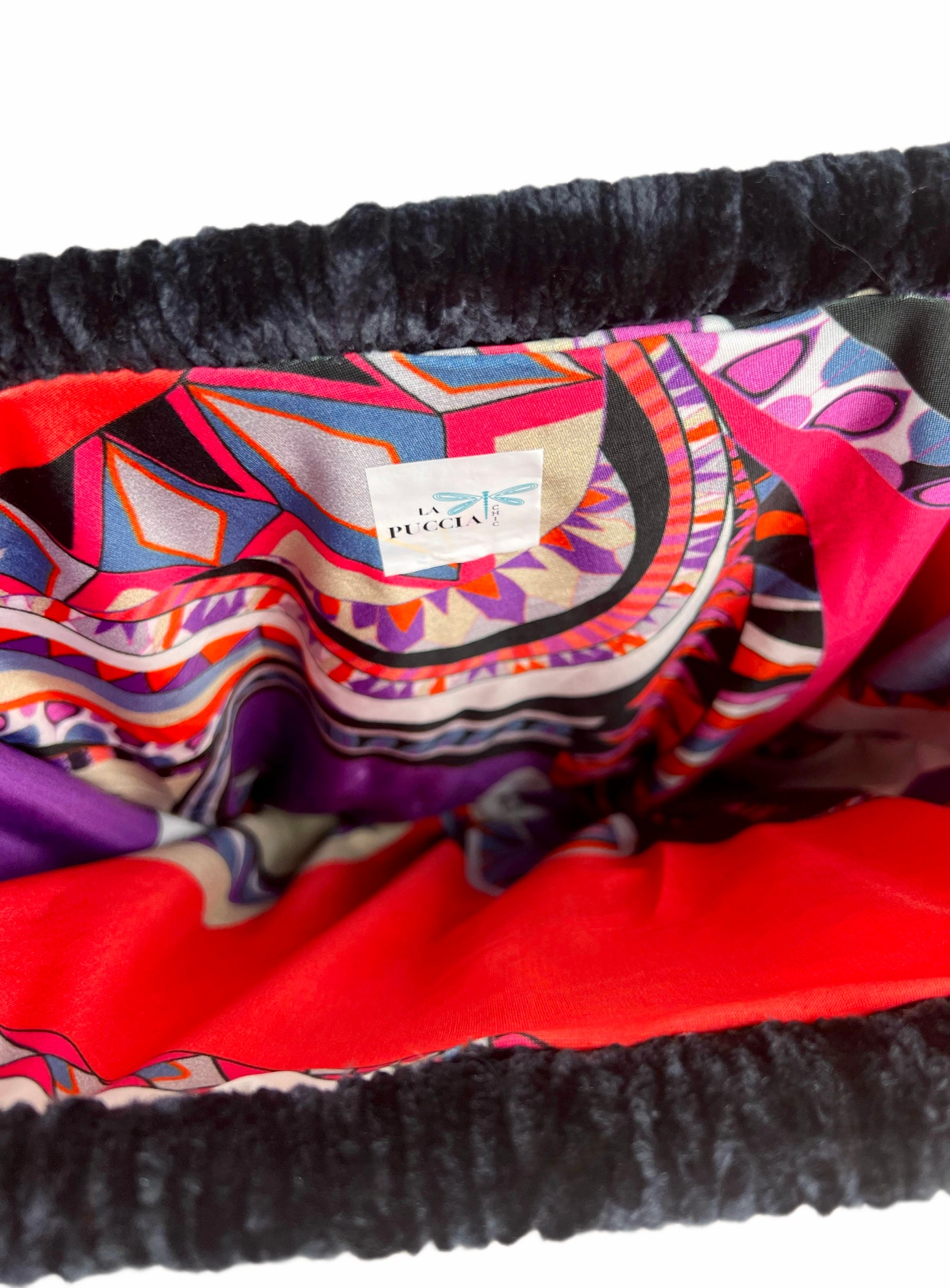 Borsa ricamata a mano su rete con filato di ciniglia nero. Fiori in rafia colorati. Manico in rattan. Foderata internamente con morbido tessuto fantasia.