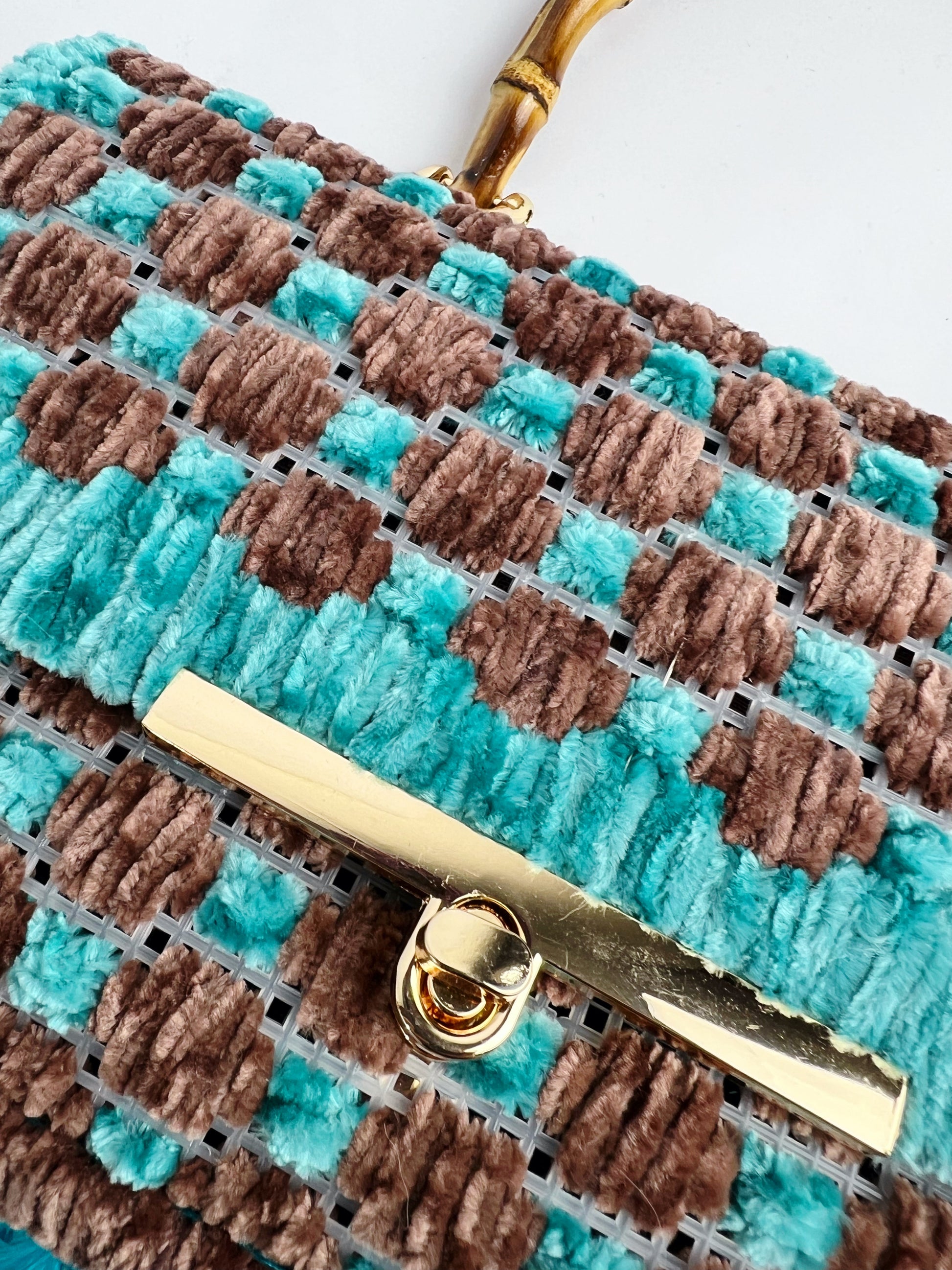 Borsa interamente ricamata a mano su base di rete in plastica. Fantasia a grandi pois, nei colori marrone e turchese. Filati utilizzati: ciniglia.