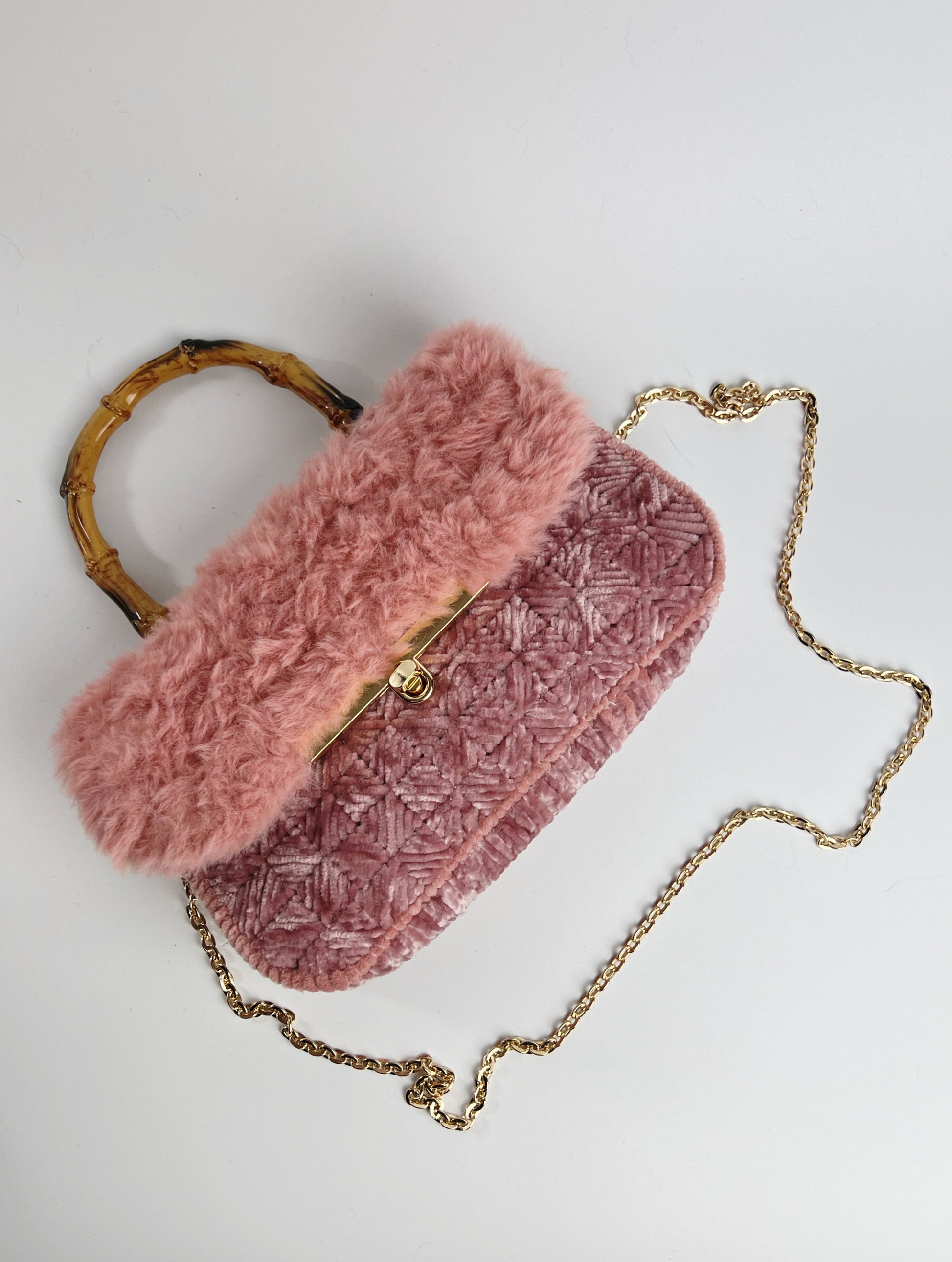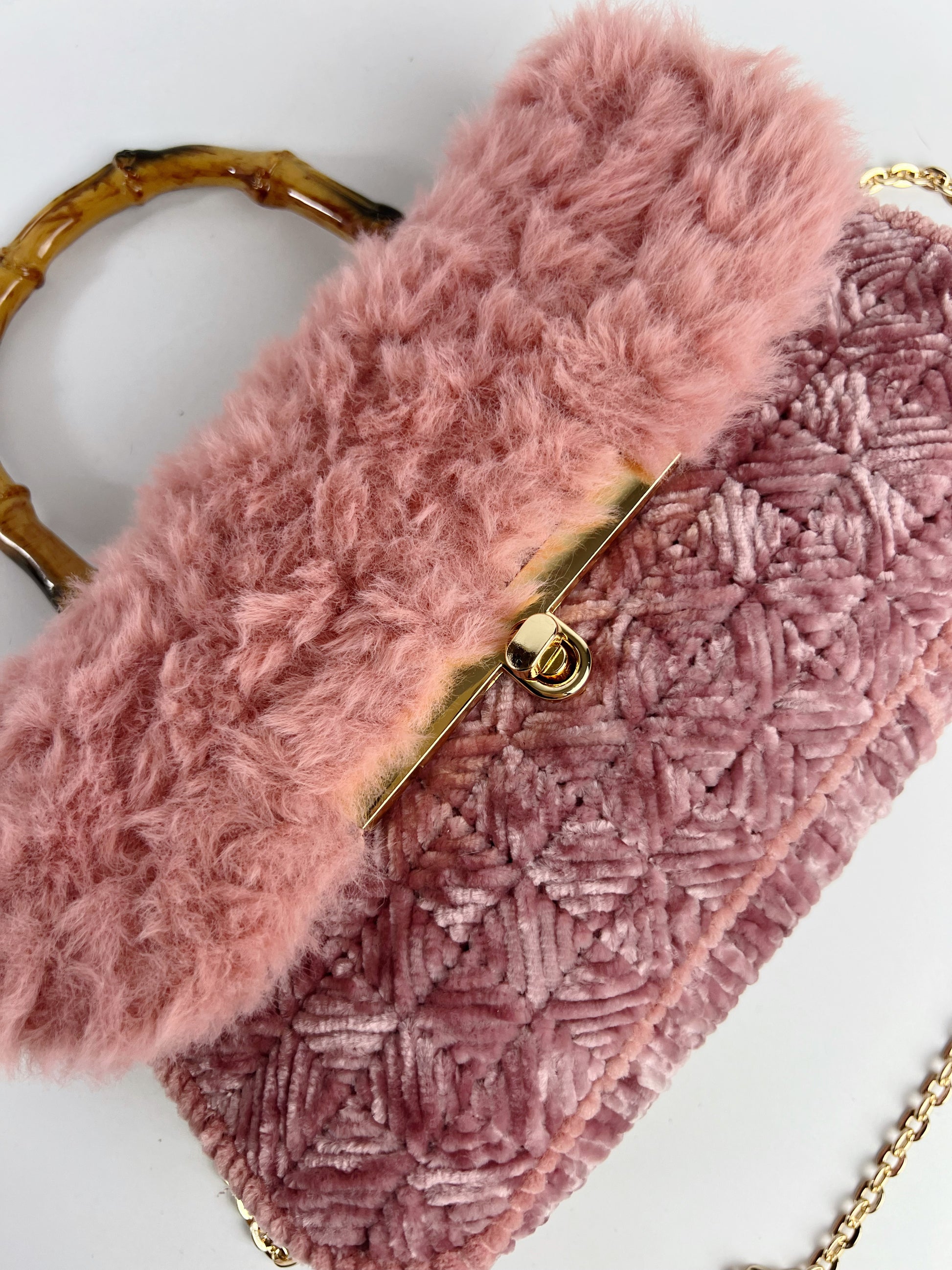 Filati utilizzati: ciniglia rosa antico, con motivo a quadretti diagonali alternati ed ecopelliccia rosa antico.