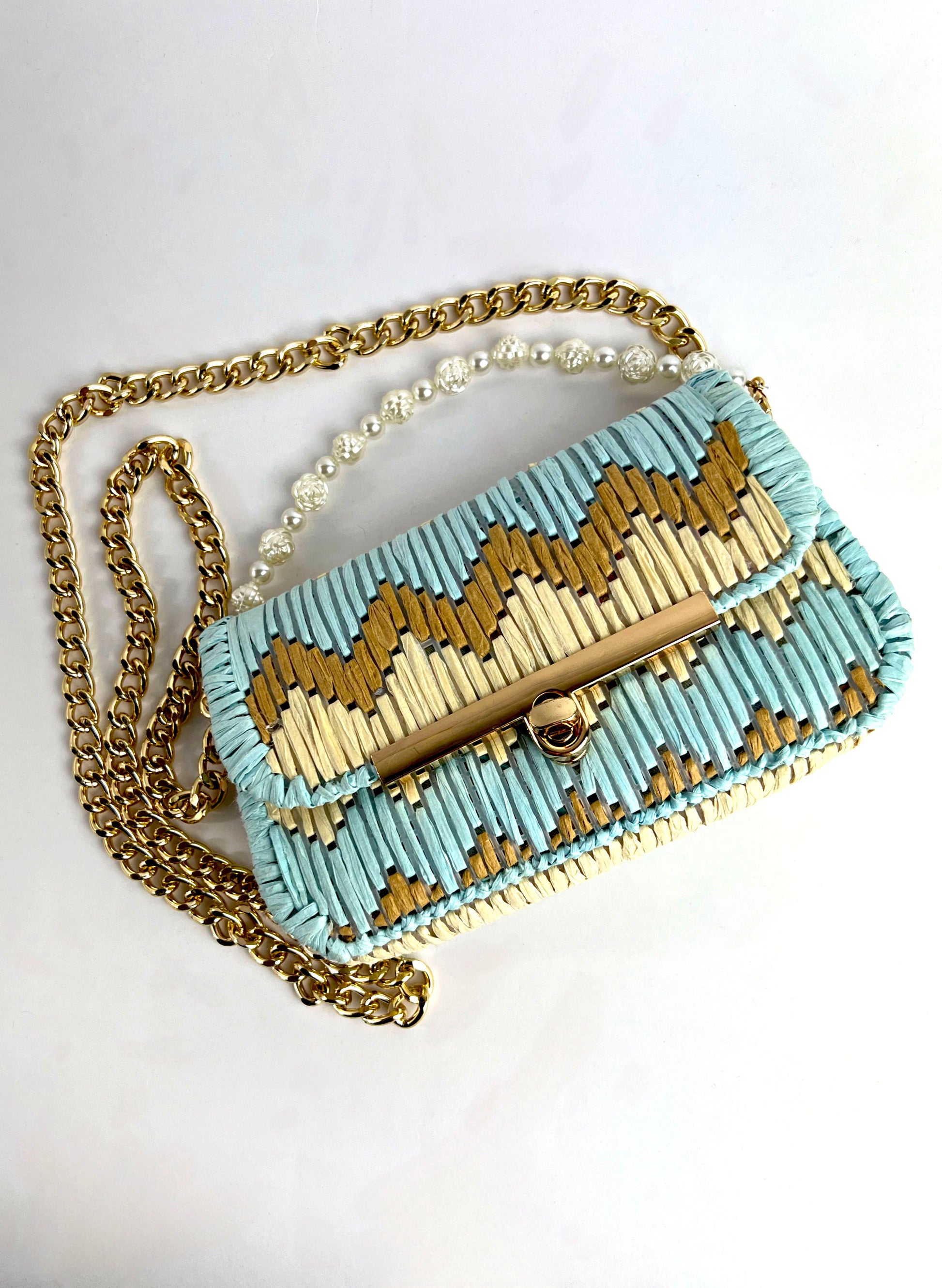 Ricamata su Rete con filato in Juta nei tre colori celeste, beige e marrone, con motivo a ZigZag. Foderata internamente. Manico in perline a rosellina. Tracolla dorata.