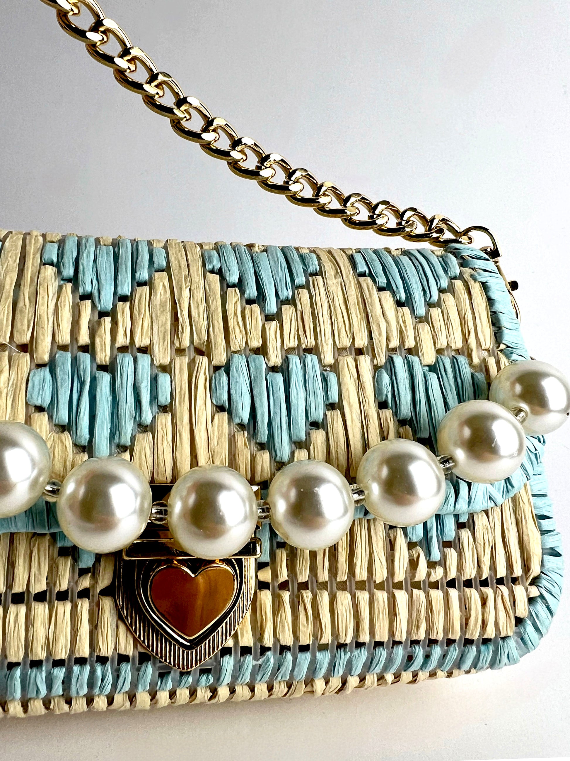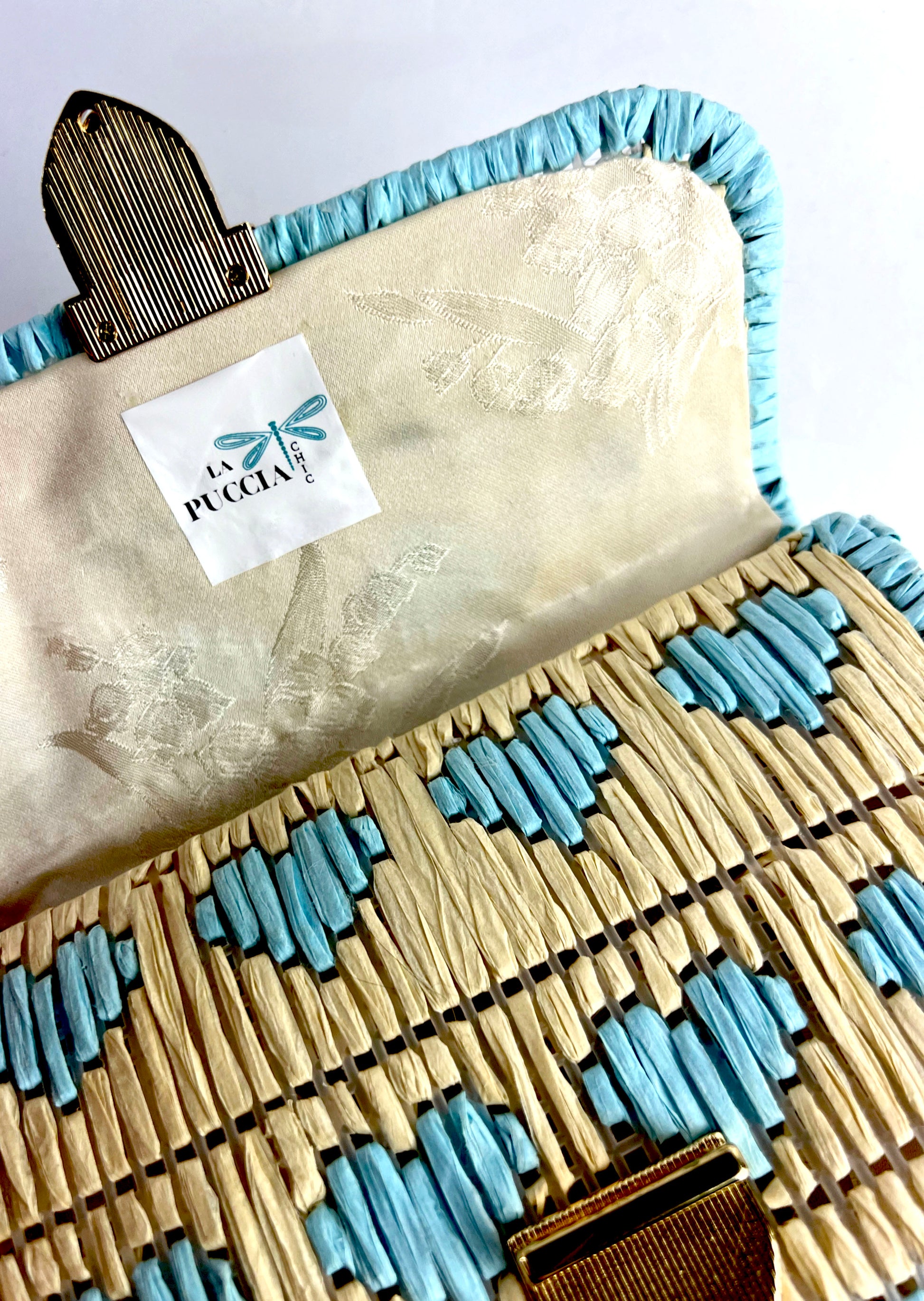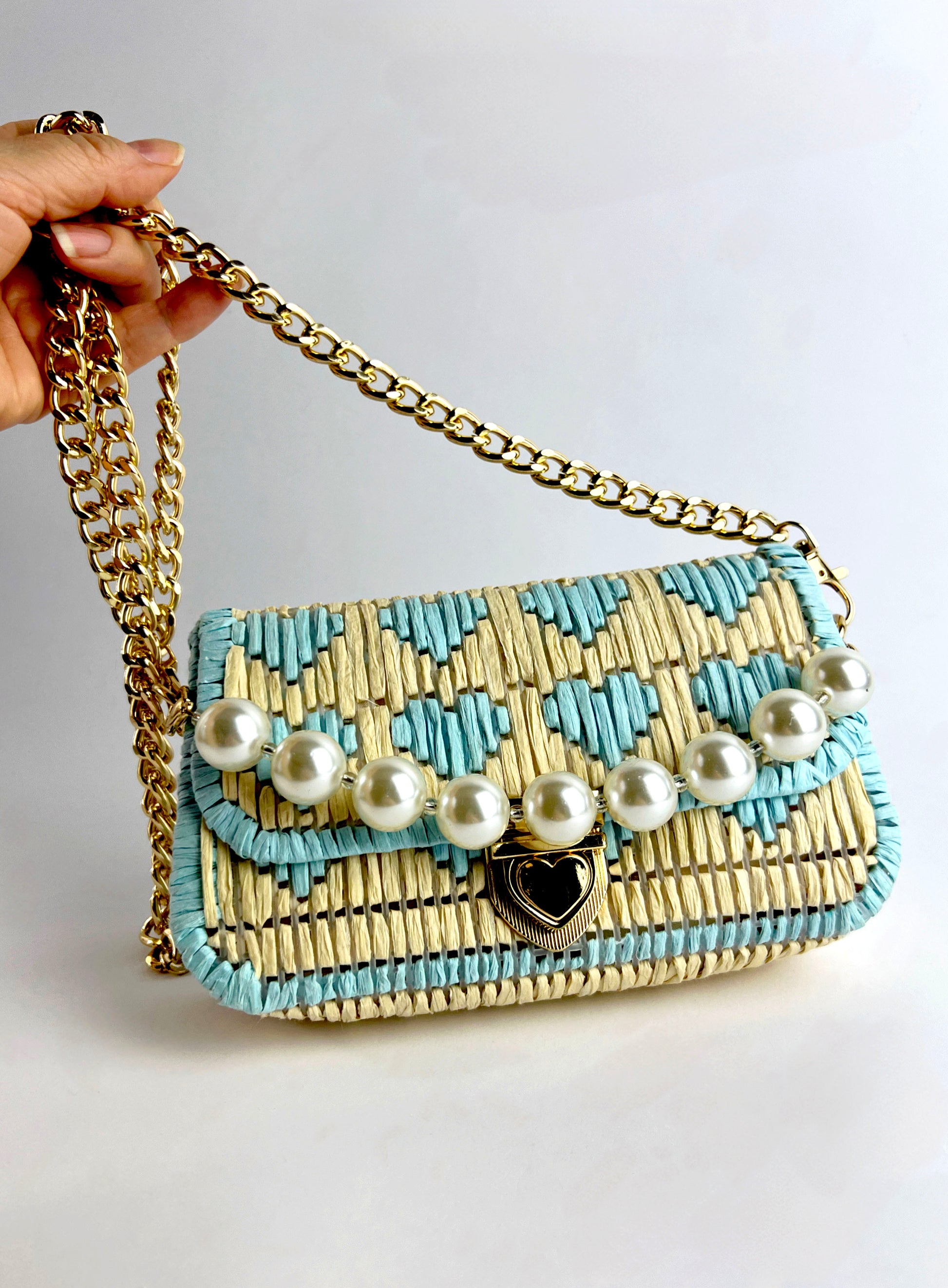 Ricamata su Rete con filato in Juta nei colori celeste e beige, con motivo a Fiori. Foderata internamente. Manico in perle. Tracolla dorata.