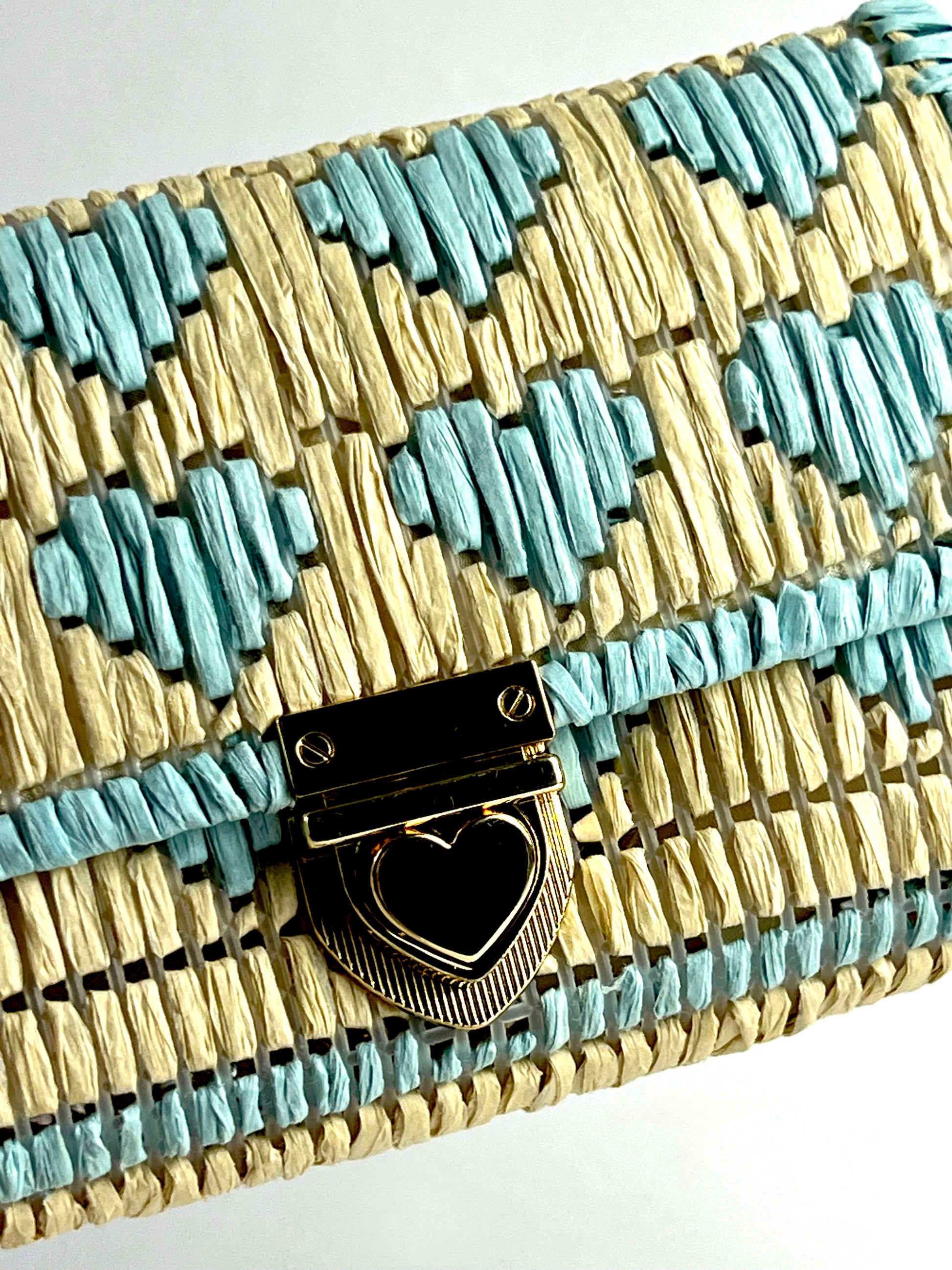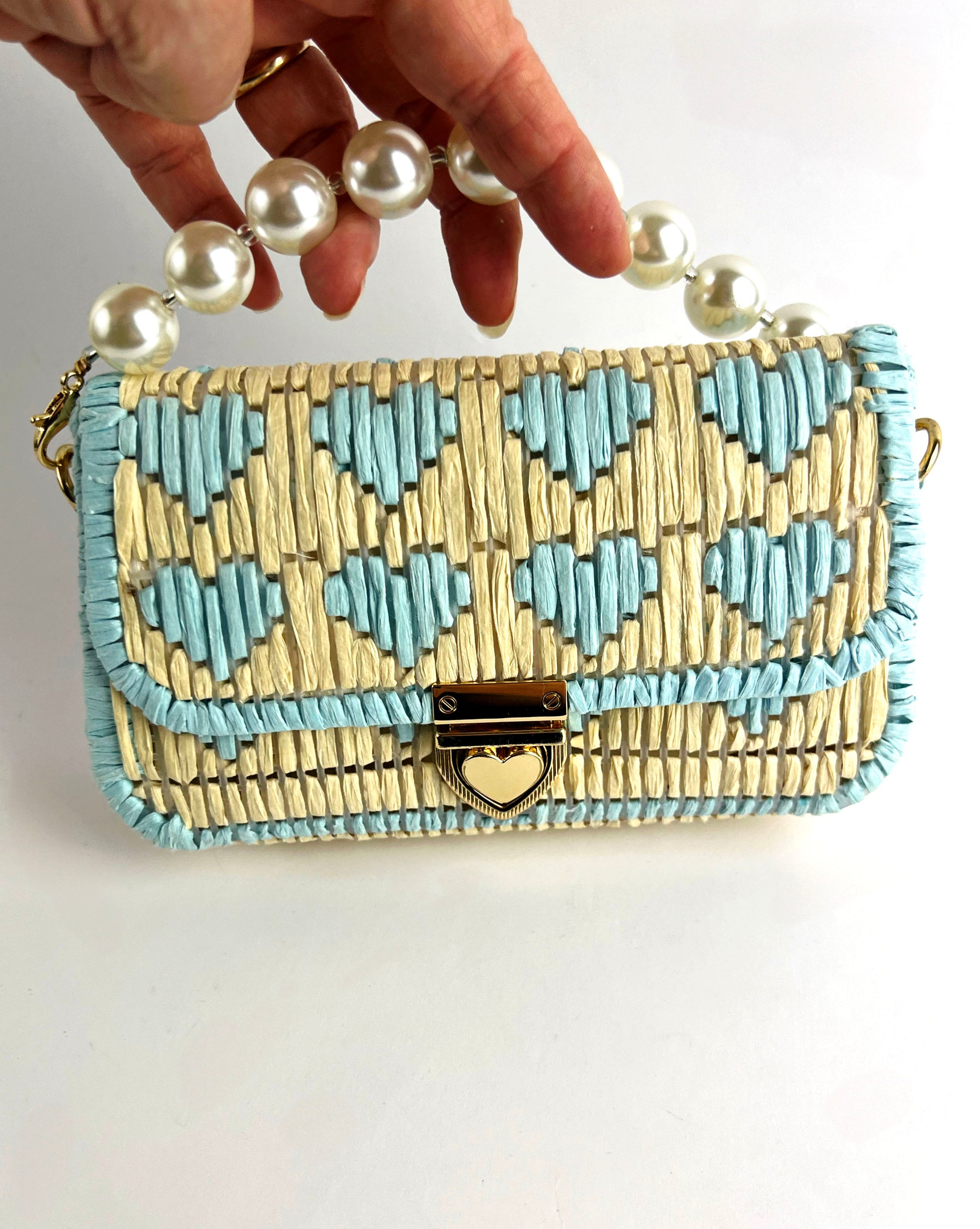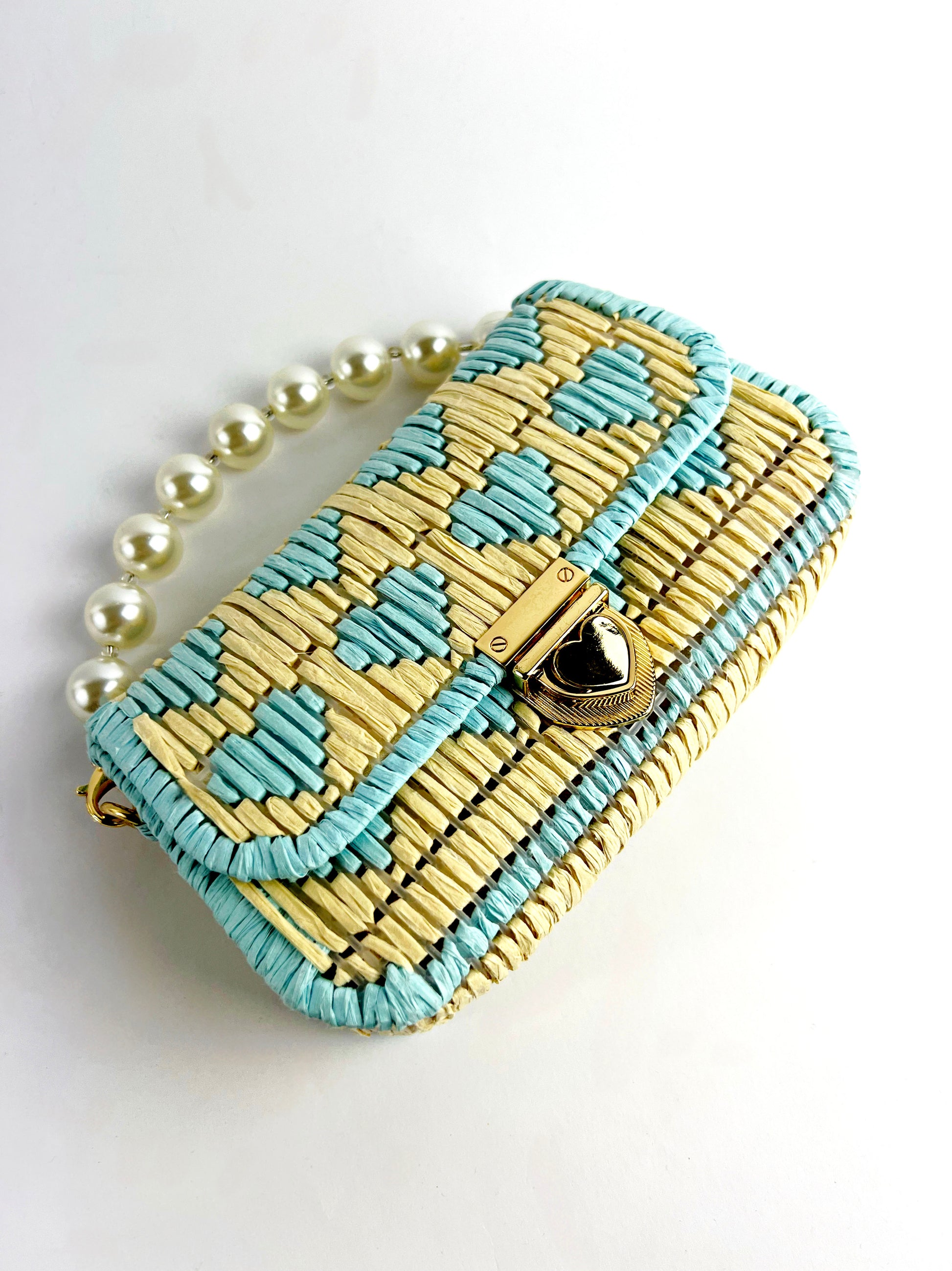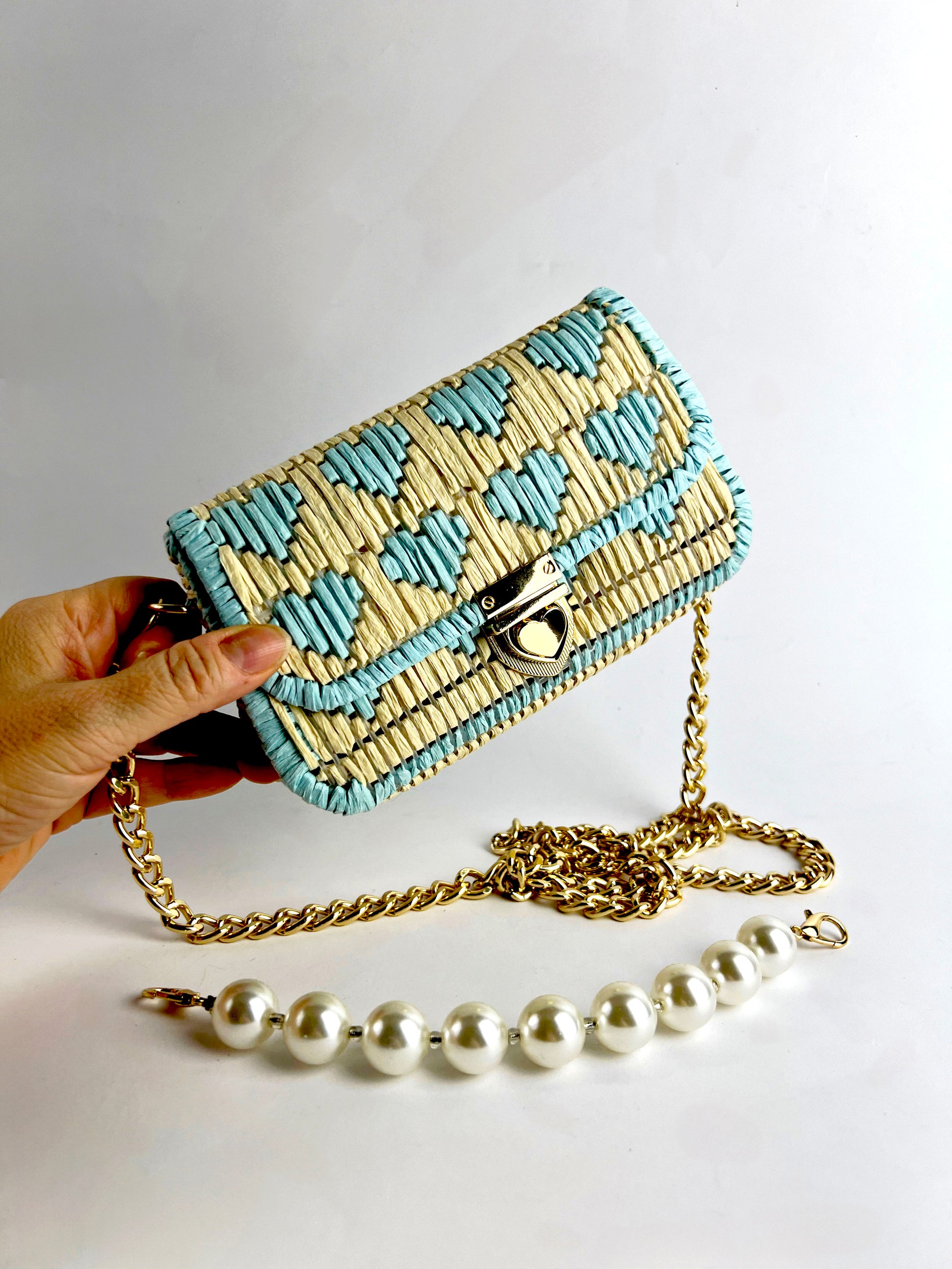 Ricamata su Rete con filato in Juta nei colori celeste e beige, con motivo a Fiori. Foderata internamente. Manico in perle. Tracolla dorata.