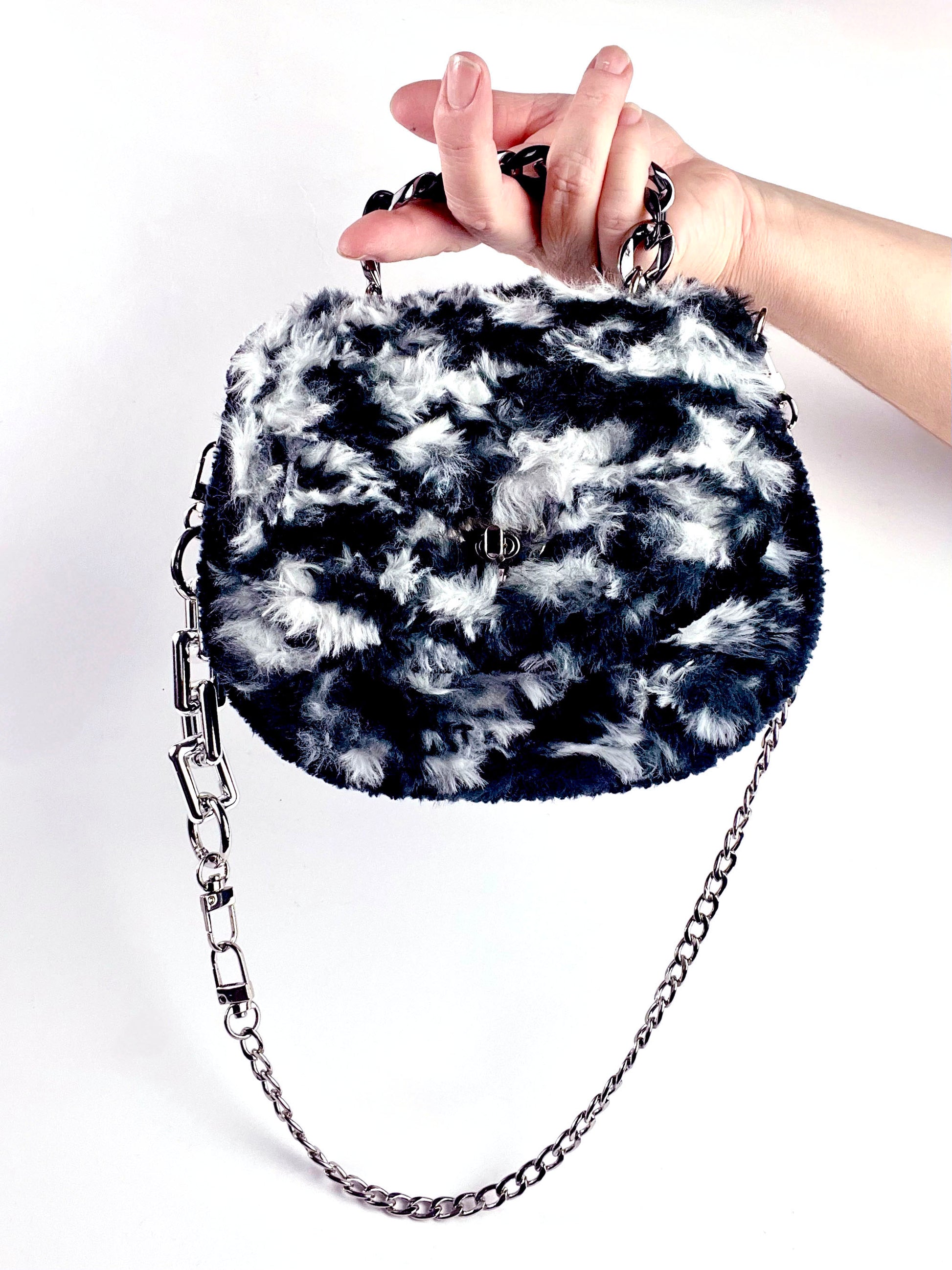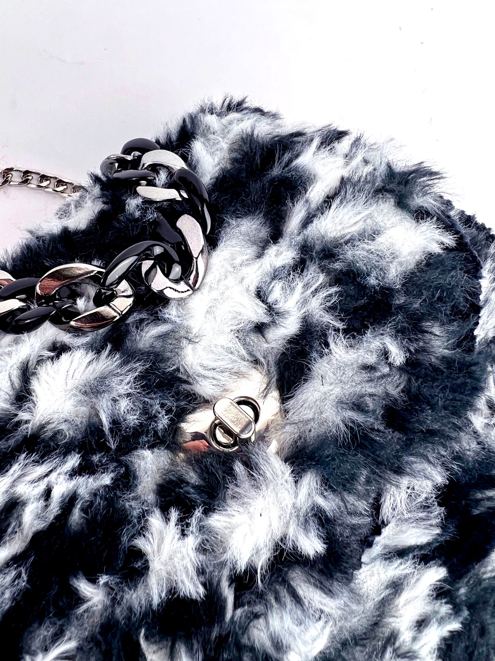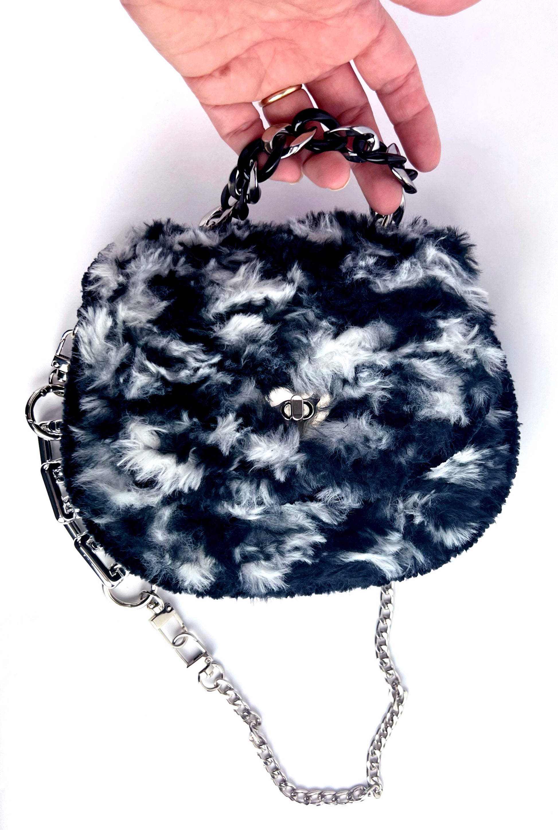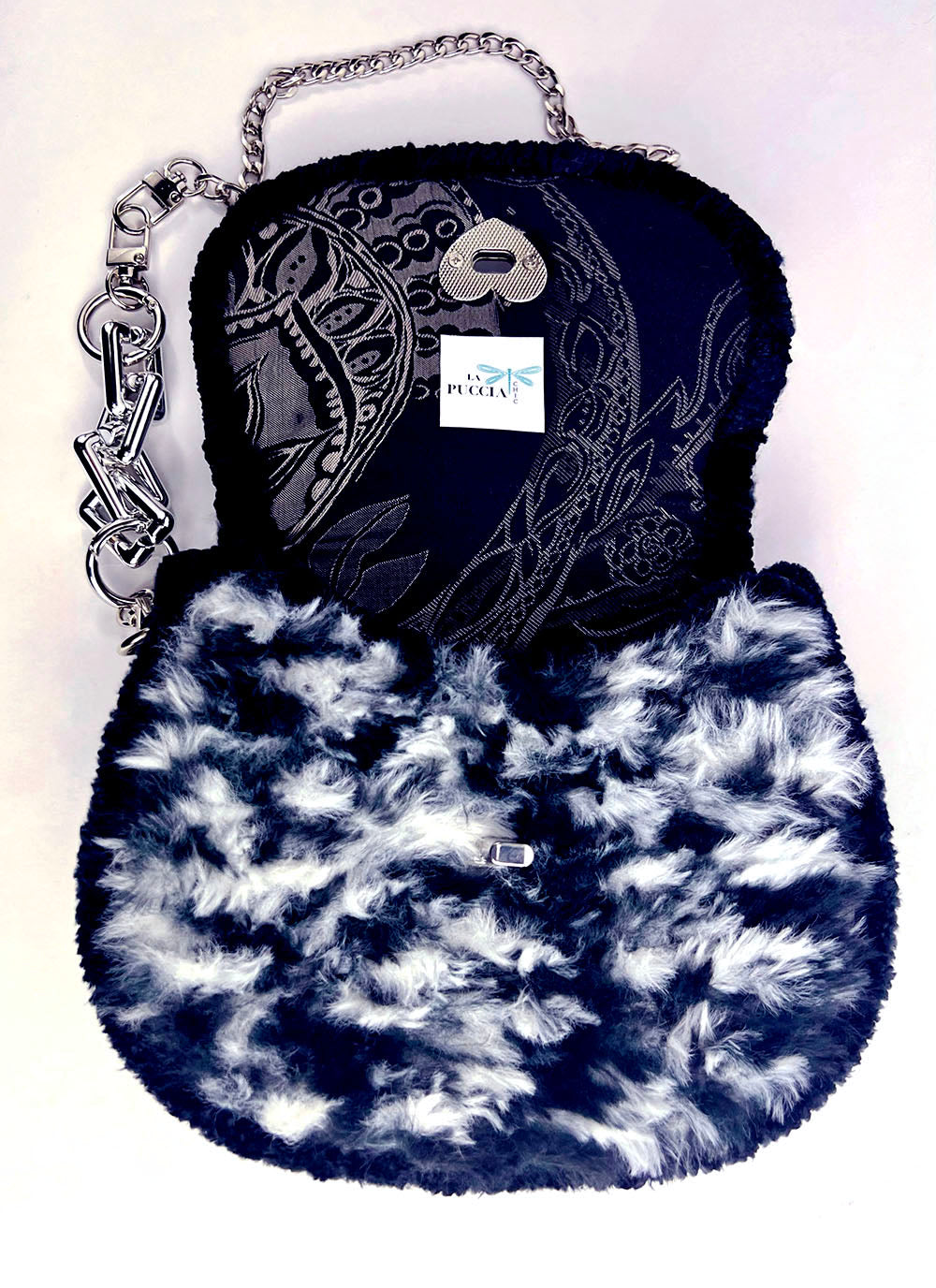 Borsetta interamente ricamata su rete, con filato di ecopelliccia bianco e nero. Chiusura a girello, a cuore, argento. Tracolla argento. Manico catena nero argento. Foderata internamente con tessuto damascato.