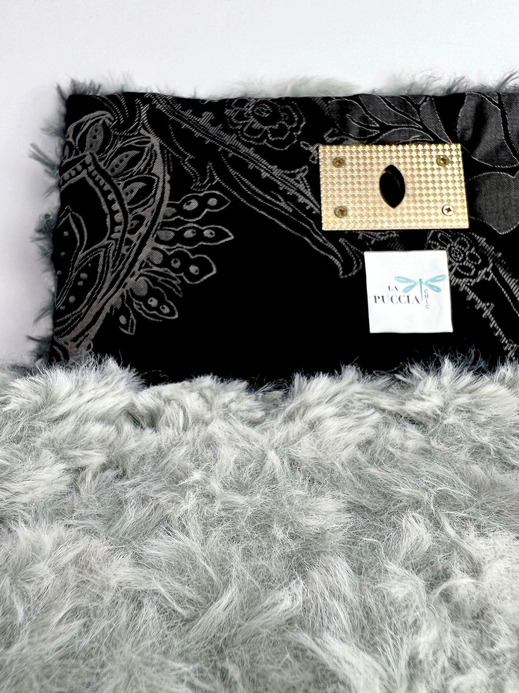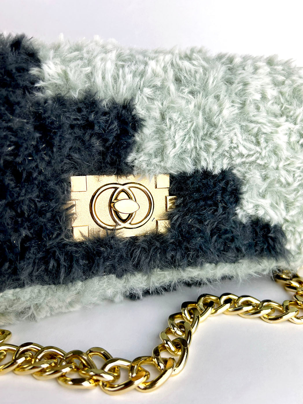 Pochette con tracolla in morbida ecopelliccia in due tonalità di grigio, interamente ricamata a mano, con motivo a scacchi diagonale. Chiusura dorata a girello. Tracolla dorata a maglie larghe. Foderata internamente con tessuto damascato grigio.