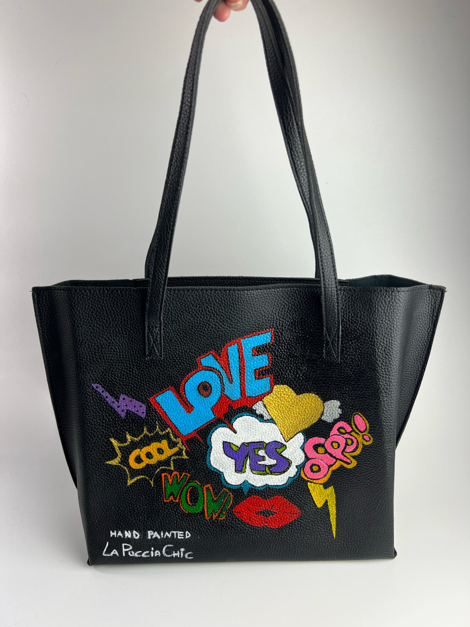 Borsa non artigianale, in ecopelle, personalizzata con scritte e disegni in stile Pop Art, realizzati a mano.